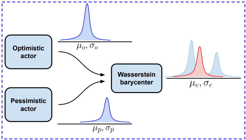 The main novelty of WBSAC is in how we combine these two distinct behaviors. We make use of the Wasserstein barycenter, a concept from optimal transport theory, to geometrically blend pessimistic and optimistic policies into a single exploration policy. This approach allows us to dynamically control the degree of exploration. Early in training, the agent behaves conservatively (pessimistic); as training progresses, we mathematically shift the barycenter weights to incorporate more optimistic behavior. This results in a “directed” exploration strategy that is significantly more sample-efficient than standard random exploration, as it guides the agent intelligently toward informative areas of the action space without destabilizing the learning process.
