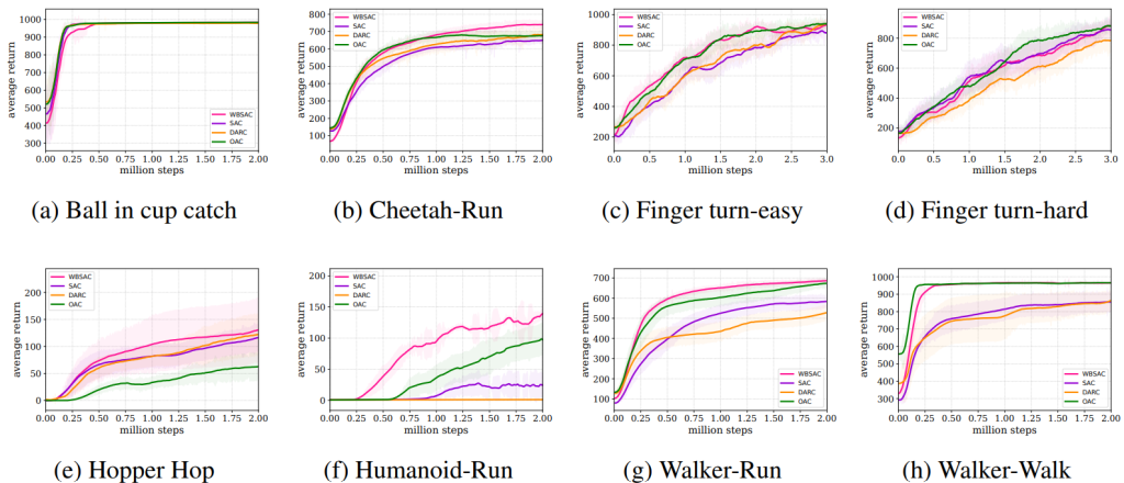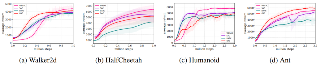 We evaluated the WBSAC algorithm on challenging continuous control benchmarks, specifically the MuJoCo and DeepMind control suit tasks. The results demonstrate that WBSAC consistently outperforms state-of-the-art baselines, including soft actor-critic (SAC) and double actors regularized critics (DARC), and optimistic actor-critic (OAC). As can be seen, our algorithm outperforms SAC and DARC in all four case studies of MuJoCo. Moreover, in all case studies except for Ant-v5, WBSAC achieves superior or comparable performance to OAC. In DeepMind control suit tasks, the results show that WBSAC outperforms the baselines and successfully solves the challenging humanoid-run task on which other methods fail. For more details, see WBSAC.